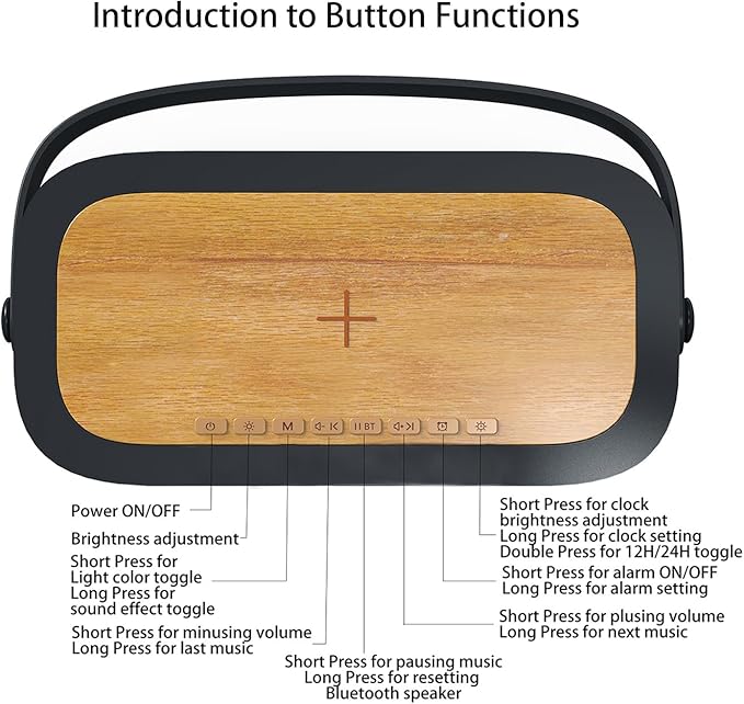 - 【Versatile Multifunctional Device】- Bluetooth speaker alarm clock with 15W fast wireless charger station, built-in 4000mAh backup battery, and 8-color night light.