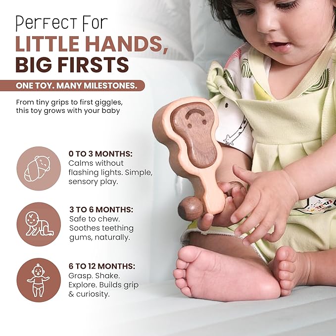 - 🎶 SOFT RATTLE FOR SENSORY STIMULATION It’s more than a baby teether — it's also a gentle wooden rattle that engages your baby’s senses with soft sounds. A calming, Montessori-style sensory toy for quiet, mindful play.