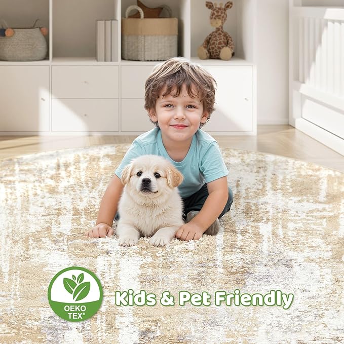 Round Rug Living Room Rugs: 5Ft Washable Circle Large Abstract Modern Soft Stain Resistant Non Slip Indoor Floor Carpet for Bedroom Nursery Office Dining Room Dorm Home House Decor- Gray Gold