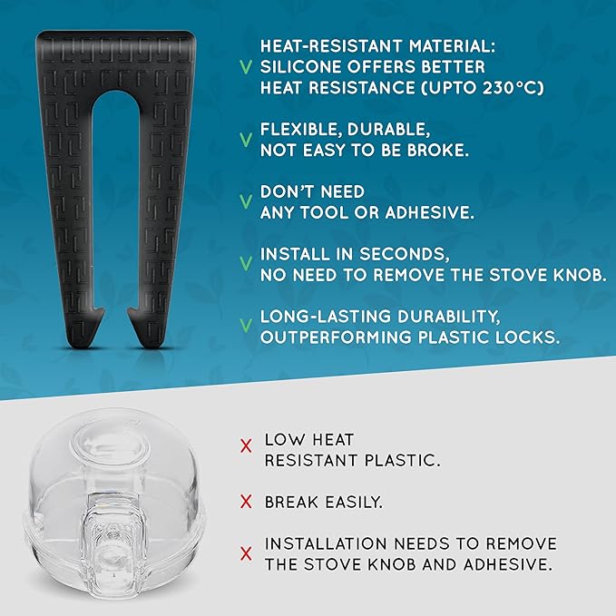 - HEAT-RESISTANT & DURABLE MATERIAL – Crafted from flexible, high-quality silicone, these stove knob safety covers are built to withstand extreme temperatures up to 230°C. Their durable design ensures they won’t degrade or warp in high-heat environments, making them reliable for daily use. Keep your kitchen safe with confidence, knowing these gas stove child safety knob locks will endure even the toughest cooking conditions.