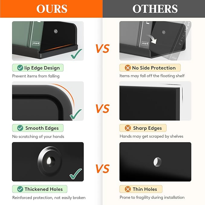 - 2 Ways to Install: The two hanging options are upward or downward. Acrylic shelves come with pre-drilled holes, detailed instructions, and all necessary mounting hardware, including screws, wall anchors, and bubble lever, which make installation simple and easy in just a few minutes.