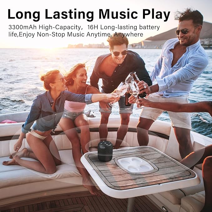 - [IPX7 Waterproof] With an IPX7 waterproof rating, this speaker offers superior protection against rain, dust, snow, and spills. It can even be fully submerged in water up to 3 feet for up to 30 minutes. Whether you're showering, hiking, or camping, you can enjoy your music without worrying about the elements. Make your adventures even more exciting and be the life of the party, no matter the weather.