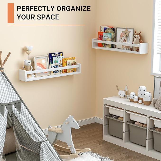 - [Ample Storage Space] - Measuring 24 inches, these nursery shelves offer ample room for organizing children's books, toys, photos, and other small items. They encourage a love for reading while keeping spaces tidy. With 0.6โ thicken panels, each bookshelf can hold up to 30 LBS