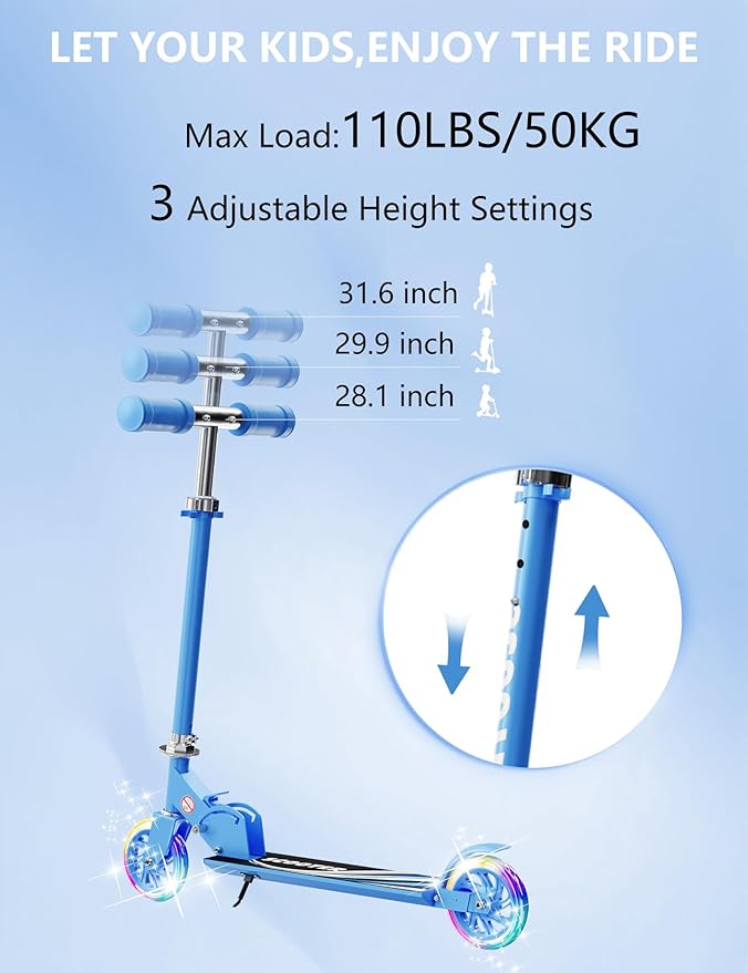 - 📏 ADJUSTABLE HEIGHT FOR GROWTH – Designed to grow with your child, this scooter offers 3 handlebar height options (27.55"/70cm, 29.52"/75cm, 31.50"/80cm). Perfect for scooters for kids 3+.