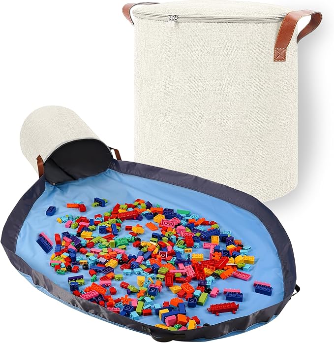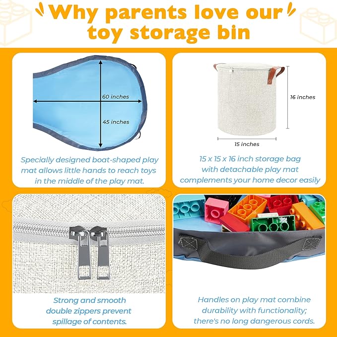 - Safe, Functional And It Has Zippers – There are no tangly cords or buttons to worry about, making it safe for kids of all ages. Our play mat has durable handles for tipping the toys back into the storage bin. We have also included double zippers on the lid so that nothing can spill out accidently. Warning: Children below 3 years of age must be supervised when using this storage bin and its play mat.