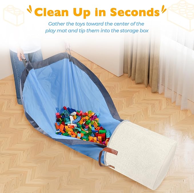 - Tidy Up In Seconds – This storage organizer provides ample storage for building bricks and other small toys. Spread out the play mat, and now you have a dedicated area for creative play. When it's time to pack up, gather the handles of the play mat and gently tip all the toys back into the compact storage cube. The mess is easily cleared away instantly.