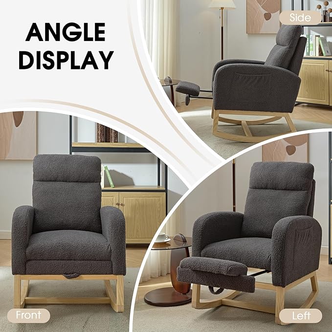 - Adjustable Footrest&Ergonomic Design - Our nursery rocking chair is equipped with good footrest that can provide your feet with extra support , allowing you to sit comfortably even when sitting for a long time. Soft backrest and smooth armrests let your body more easeful, What's more, there is a pocket on the side of the armrest, which is convenient for you to put magazines and TV controller. Provide you with more convenience.