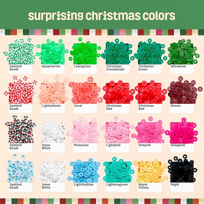- BRACELET KIT INCLUDED - Flat clay beads in 24 selected colors, includes 4 handcrafted speckled beads, each is about 160pcs. 240pcs gold letter beads. Approx. 120pcs 4mm seed beads in christmas red, green and white. Red crystal diamond-like beads. Christmas-themed, fruits style, flower style polymer clay beads. Smile beads, pearl beads, colorful heart, starfish, and gold spacer beads. Christmas-themed pendants includes Santa, reindeer, xmas tree, stocking stuff, etc