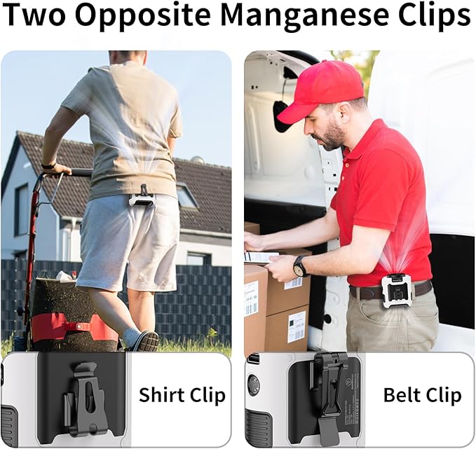 - 【With Silicone Cover, Non-Slip and Anti-Drop】Our mini portable waist fan is designed for various outdoor usage scenarios, catering to occupations like workers and farmers. It comes with a high-quality protective silicone leather case which protects from shock when dropped and ensures the body fan is not damaged at all. The upgraded Manganese steel clamp provides stronger gripping force, always keeping the wearable fan firmly, and is more durable. Practical design with two clips facing opposite directions allows for more placement options