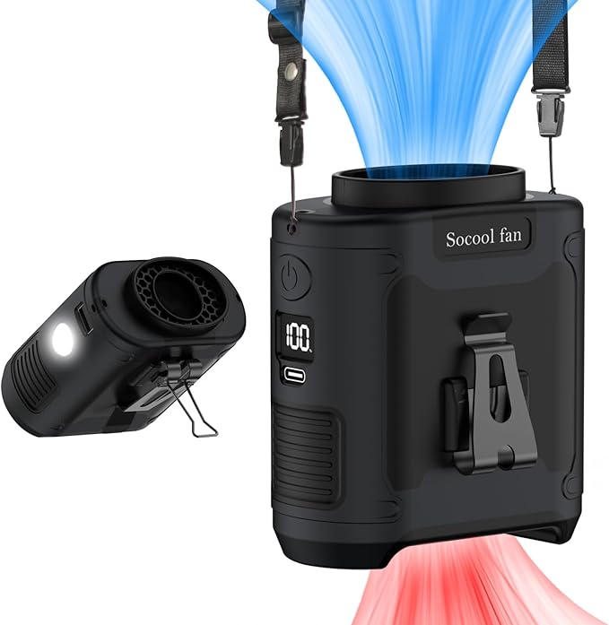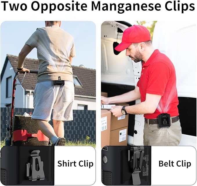 - 【With Silicone Cover, Non-Slip and Anti-Drop】Our mini portable waist fan is designed for various outdoor usage scenarios, catering to occupations like workers and farmers. It comes with a high-quality protective silicone leather case which protects from shock when dropped and ensures the body fan is not damaged at all. The upgraded Manganese steel clamp provides stronger gripping force, always keeping the wearable fan firmly, and is more durable. Practical design with two clips facing opposite directions allows for more placement options