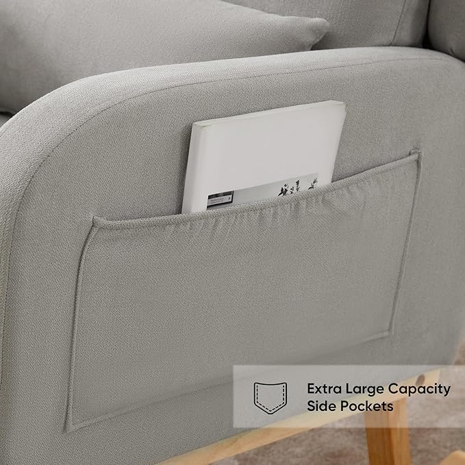 - 【Stylish and Versatility】 Embrace modern elegance with the stylish wing back design and sleek lines of this accent glider rocking chair. Its chic appearance adds a touch of sophistication to any room, elevating your interior decor. Comes with side pockets, you can easily put bottle, mobile phone, magazines,TV controllers or other clutters conveniently.