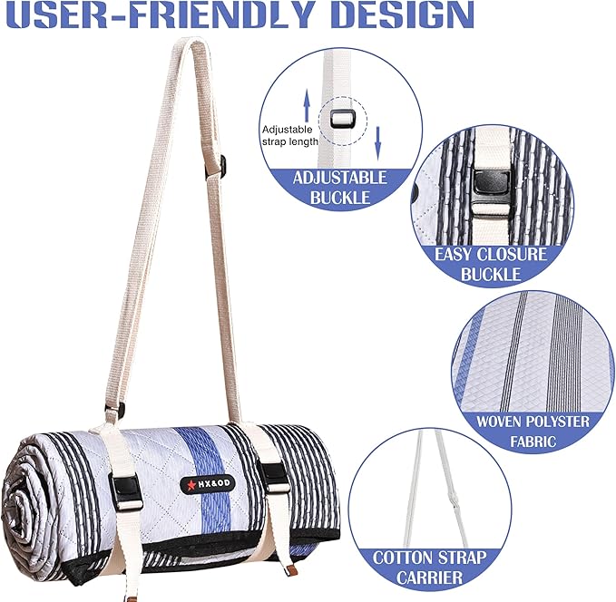 - CONVENIENT STORAGE AND PORTABLE: The camping blanket comes with a storage strap for quick folding and storage. And with stretchable shoulder strap. The process of traveling to the campsite or after the camping is over can free your hands. VERY CONVENIENT