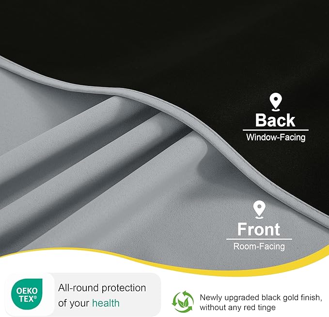 - 100% BLACKOUT: These curtains are manufactured in a STANDARD 100 certified by the OEKO TEX factory. The curtains feature triple weaving with black yarn, an extra light-blocking layer, and high-density weaving, which can 100% physical blackout bright sunlight and UV ray, bring you a full room darkening environment for good night sleep, afternoon nap and weekend lie-ins.