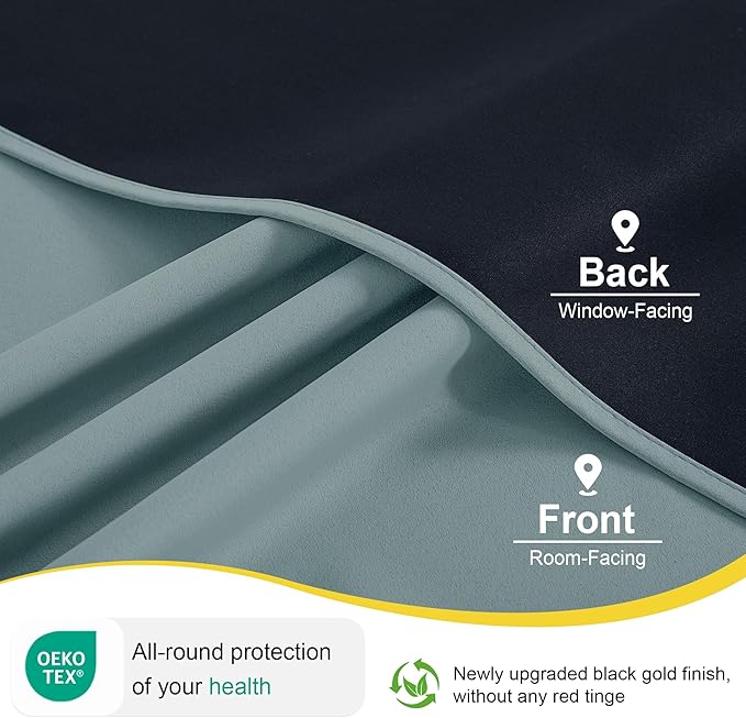 - 100% BLACKOUT: These curtains are manufactured in a STANDARD 100 certified by the OEKO TEX factory. The curtains feature triple weaving with black yarn, an extra light-blocking layer, and high-density weaving, which can 100% physical blackout bright sunlight and UV ray, bring you a full room darkening environment for good night sleep, afternoon nap and weekend lie-ins.