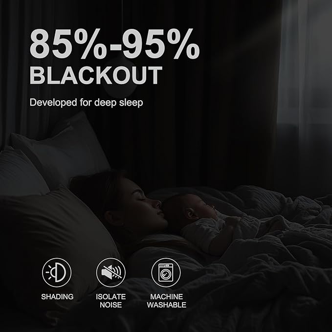 - ROOM DARKENING: These curtains are manufactured in a STANDARD 100 certified by the OEKO TEX factory. The curtains made by black gold bottom covering technology. Non-coated, Non-chemical, which can block out 85%-95% bright sunlight and UV ray, bring you a full room darkening environment for good night sleep, afternoon nap and weekend lie-ins.