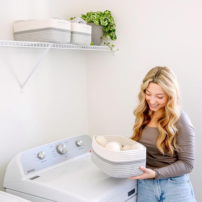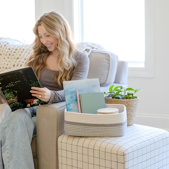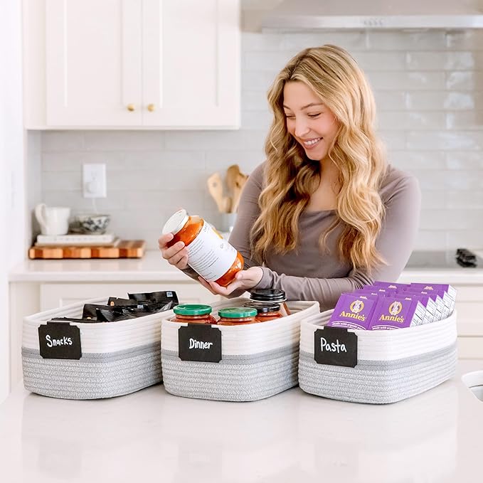 - Safe, Natural Cotton Organizer Bins: Crafted from the highest quality material in the market, our storage bins are oh-so-sturdy (and cute) and ready to take on little humans. They’re 100% safe, so you can rest easy if teething toddlers take a nibble. Reinforced Hidden Handles: Now you see ‘em, now you don’t! With completely hidden handles that blend seamlessly into the rope basket, you’ll be the Houdini of home organizing. They’re even double-stitched and reinforced for extra heavy loads!