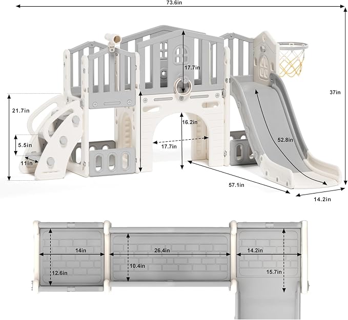 - Perfect Gift: If you're looking for a gift for children, this multifunctional play set is your best choice. Kids can climb the ladder, balance on the castle-themed corridor, slide down the slide, crawl through the tunnel, and shoot balls into the basketball hoop.