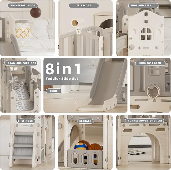 - Educational Toddler Slide Set: Suitable for ages 0-3! Our toddler slide set includes a slide, an arch, a storage compartment, a basketball hoop, a telescope, a three-tiered staircase, and a corridor.
