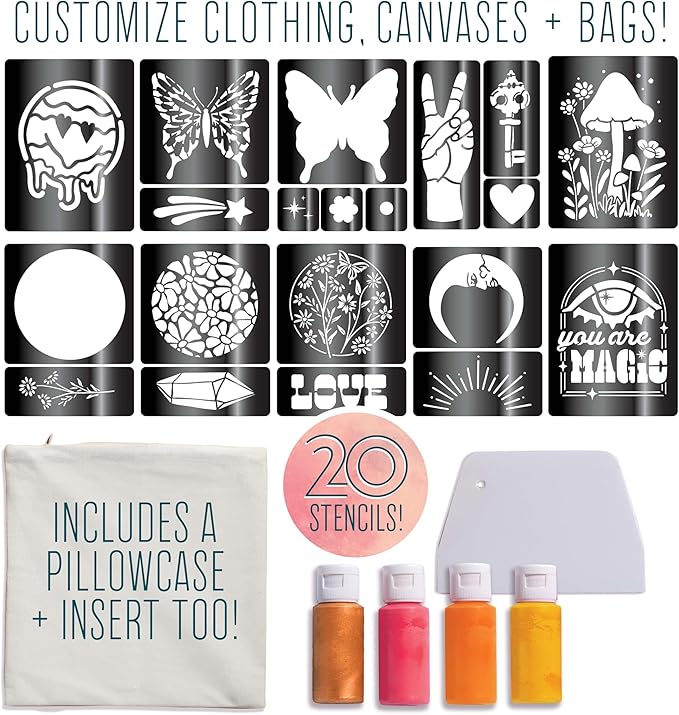- Complete DIY Kit – Includes 4 vibrant fabric paints (including metallic bronze), 20 reusable stencils, squeegee, tape, and even a pillow and pillowcase to kickstart your creations!
