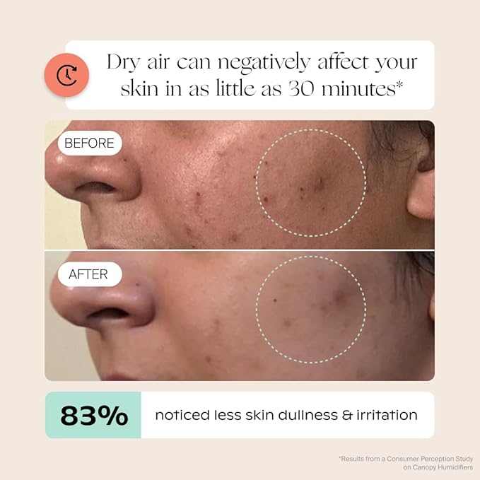 - THE HEALTH BENEFITS OF HUMIDITY: The Canopy Humidifier helps optimize your living space to have the ideal level of humidity. Ensuring proper humidity helps to hydrate skin; combating dryness, dullness and fine lines & wrinkles. Increased skin barrier function to protect from pollution. Alleviate cough, nasal congestion and other symptoms of cold, flu and allergies. Provide clean and safe aroma diffusion for a calming environment