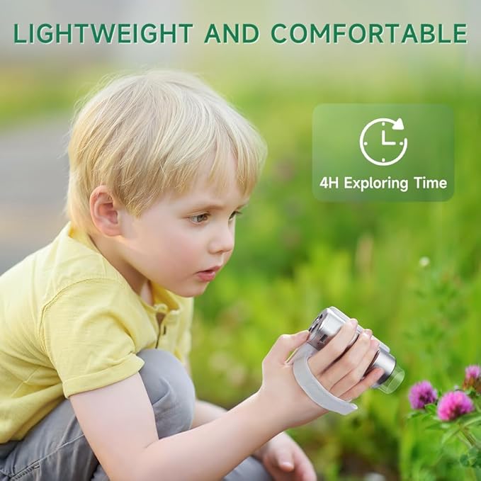 - Kid-Friendly Design: No assembly required! Weighing under 300 grams, this mini microscope is tailored for kids. With a convenient wrist strap, it's perfect for spontaneous backyard adventures, park outings, or field trips, fostering independent exploration.
