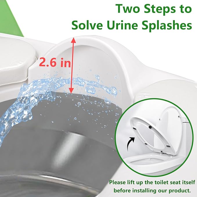 - Splash-proof and Easy to Clean: Lift up the adult toilet seat and place baby toilet seat on the toilet bowl, along with the splash guard that is up to 2.6” deep to solve the urine splash problem. The removable upholstery can also be easily removed for cleaning for regular care