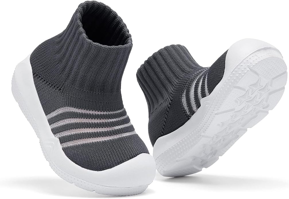 • Friendly Sock-like Upper: Sock-like stretchy textile construction upper hugs the foot to keep them comfortable and flexible when babies are on the move. Baby sock shoes made of soft fabric knit are also friendly to the skin, healthy, and very safe for infant babies.