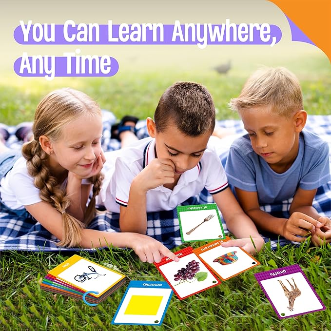 - 60 Double-sided Bilingual Cards: It comes with 60 word cards and 2 plastic rings. Each card features English on one side and Spanish on the other, allowing children to learn vocabulary in two languages. It measures 4.7" x 3.2", compact enough for little hands while providing ample space for clear and legible words and illustrations.