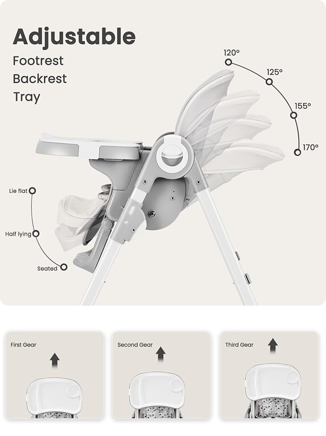 - Fully Adjustable Design: Customize for your baby's comfort with a 3 level footrest, 4 position reclinable backrest, and 3 position adjustable tray. Both the tray and footrest adapt as your child grows.