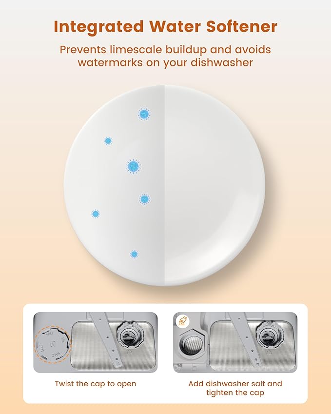 - Integrated Water Softener - The HAVA Portable Dishwasher is now equipped with a water softener that effectively deals with hard water problems. Choose the softener setting based on your water hardness to prevent limescale buildup inside the machine and avoids watermarks on your dishware, to ensure optimal cleaning results.