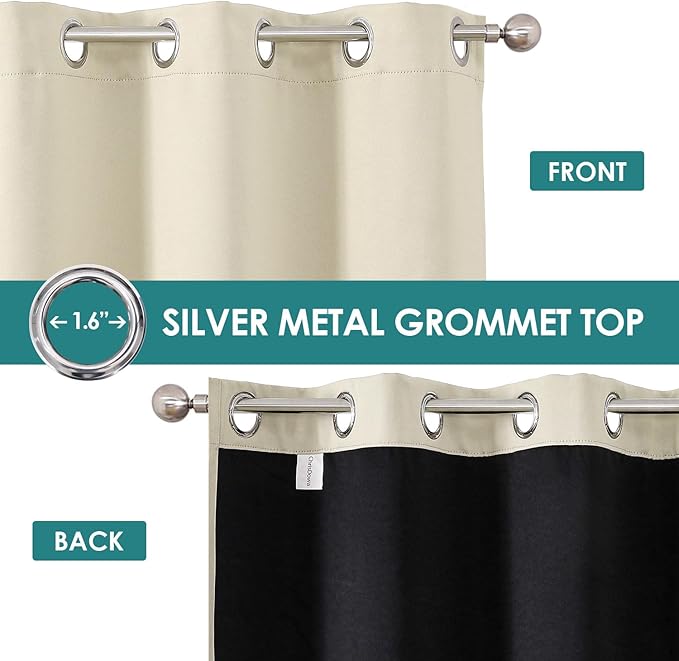 - SET DETAILS: Set of 2 total blackout curtain panels per package. Each lined curtain measures 42 inch wide by 84 inch long with 6 silver metal grommets (1.6 inch inner diameter) on top, easy to install and slide.