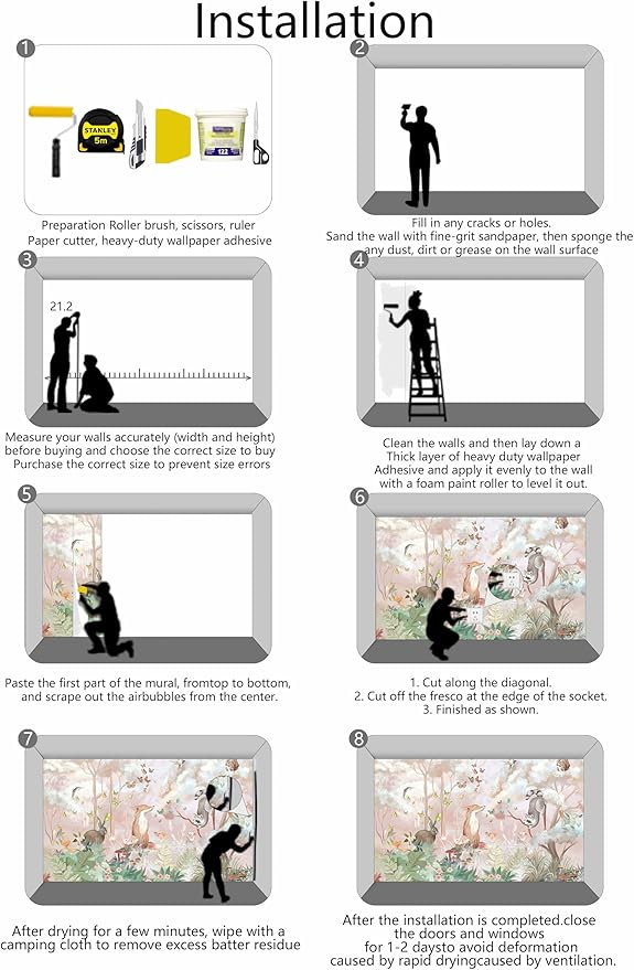 - Installation Steps1. Fill in any cracks or holes and clean the surface of the wall of dust, dirt and grease.2. Apply heavy-duty wallpaper paste to the wall, not the mural.3. Mark the position of each strip of wallpaper with a spirit level.4. Align the pattern and slide it into place.5. Scrape the bubbles with a spatula.6. Let it dry for a couple of minutes and it's ready to go!