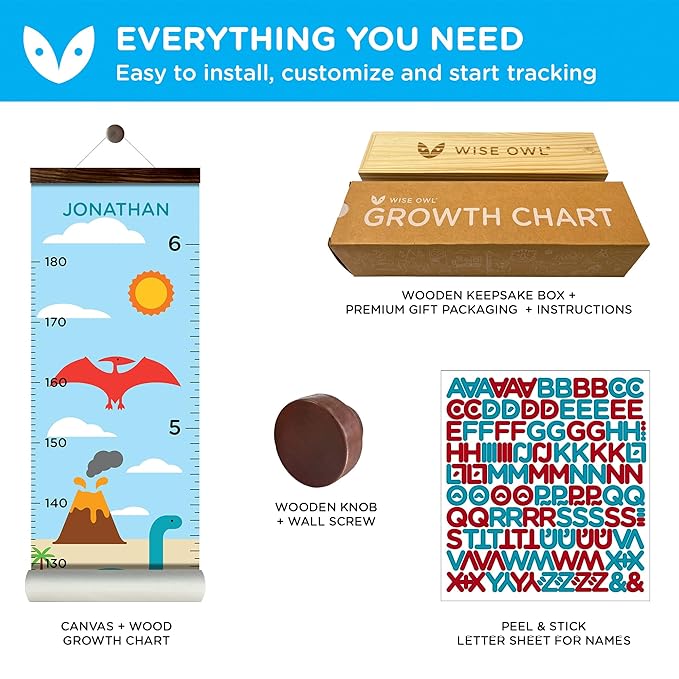WISE OWL Personalized Growth Chart for Kids - Height Wall Chart for Boys with Peel & Stick Letters for Name - Hanging Canvas Wall Measurement Height Tracker for Baby Gift (Dinosaurs)