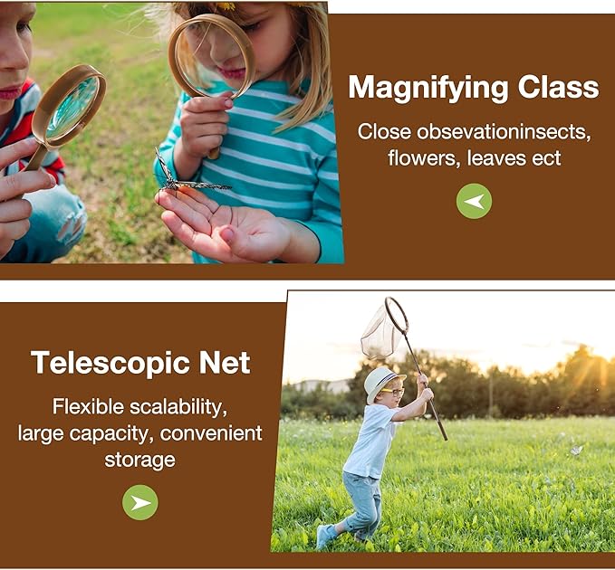 - 【All-in-One Adventure Kit】 This comprehensive set includes a magnifying glass for close-up observations, an extendable net, tweezers, a grabber, a cage, a container, cards, and a portable bag. It has everything kids need to dive into exciting outdoor adventures.