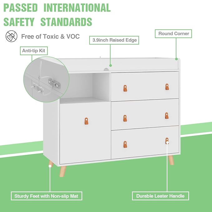 - Easy Assembly: Professionally tested and exceeding safety standards, our changing table dresser comes with an anti-tip kit to reduce the risk of furniture tipping over for children aged 5 and below. Assembly is a breeze with our comprehensive instructions.