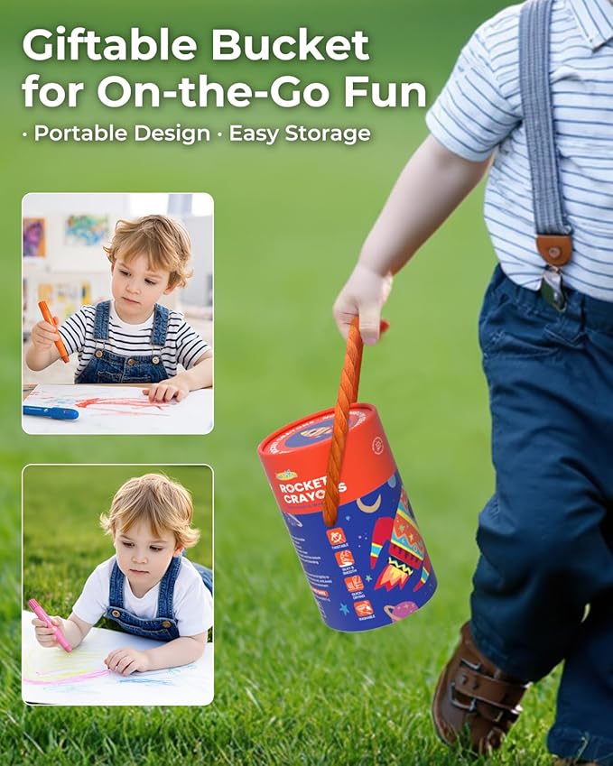 - Spark Little Imaginations with Rocket Crayons: The unique rocket-shaped design sparks children’s interest in space and science. It’s a fun way for parents and grandparents to start engaging, space-themed conversations while drawing together. Our twist crayons encourage early STEM curiosity and make learning more exciting through creative play