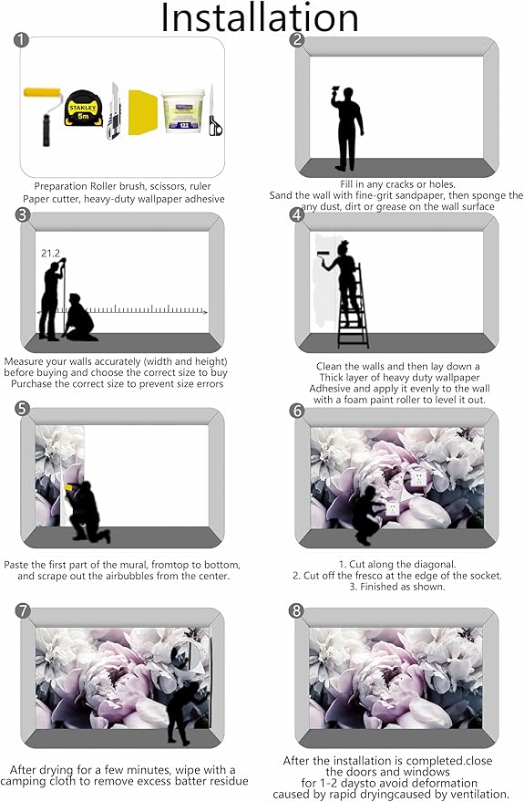 - Installation Steps1. Fill in any cracks or holes and clean the surface of the wall of dust, dirt and grease.2. Apply heavy-duty wallpaper paste to the wall, not the mural.3. Mark the position of each strip of wallpaper with a spirit level.4. Align the pattern and slide it into place.5. Scrape the bubbles with a spatula.6. Let it dry for a couple of minutes and it's ready to go!