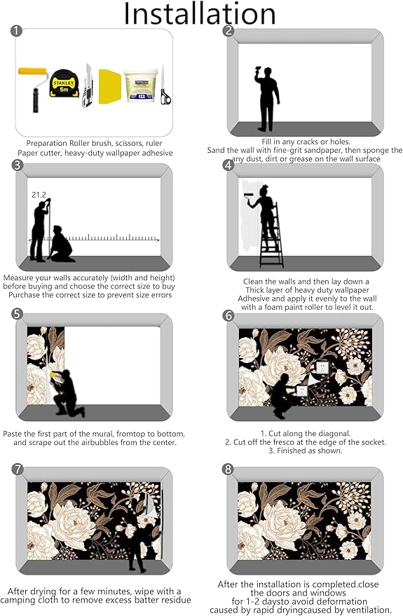 - Installation Steps1. Fill in any cracks or holes and clean the surface of the wall of dust, dirt and grease.2. Apply heavy-duty wallpaper paste to the wall, not the mural.3. Mark the position of each strip of wallpaper with a spirit level.4. Align the pattern and slide it into place.5. Scrape the bubbles with a spatula.6. Let it dry for a couple of minutes and it's ready to go!