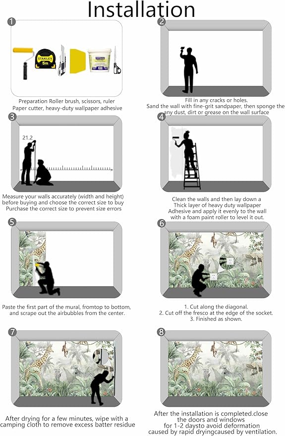 - Installation Steps1. Fill in any cracks or holes and clean the surface of the wall of dust, dirt and grease.2. Apply heavy-duty wallpaper paste to the wall, not the mural.3. Mark the position of each strip of wallpaper with a spirit level.4. Align the pattern and slide it into place.5. Scrape the bubbles with a spatula.6. Let it dry for a couple of minutes and it's ready to go!