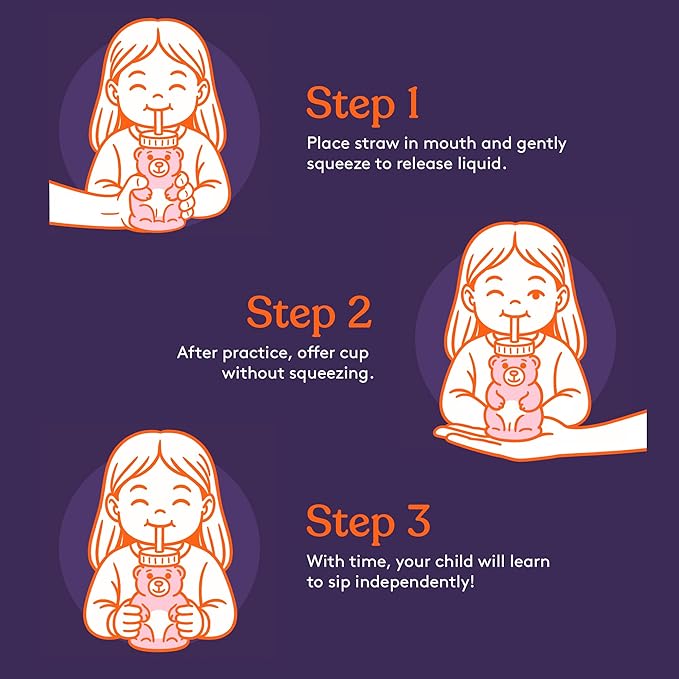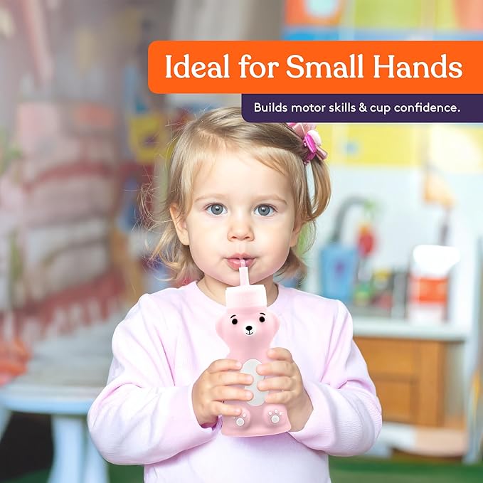 Special Supplies Honey Bear Straw Cup Long Straws, Squeezable Therapy and Special Needs Assistive Drink Container, Spill Proof and Leak Resistant Lid (Pack of 1 Bottle and 3 Straws) (Pink)