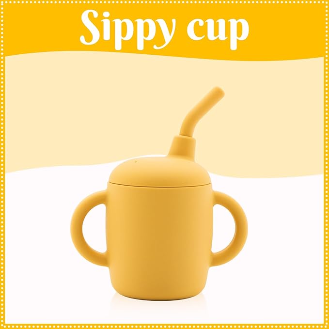 - Baby Led Weaning Supplies: Our silicone bib is designed with a deeper and sturdier pocket, making it highly effective in catching dropped food and easy to clean. The adjustable circular design is particularly gentle on your baby's skin. Our training cup is expertly crafted to fit snugly in your baby's small hands and mouth, safeguarding their developing teeth. Furthermore, the straw is equipped with a spill-proof function, aiding babies in transitioning from breastfeeding and promoting independent drinking.