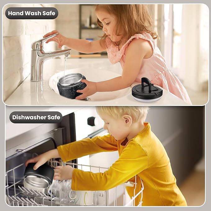 - Leak Proof Design: The compression vacuum design with seal washer guarantees 100% leak-proof, the hidden handle and hidden folding spoon are designed for easy opening and carrying. Don't worry about it spilling out and messing up kids lunch bag.