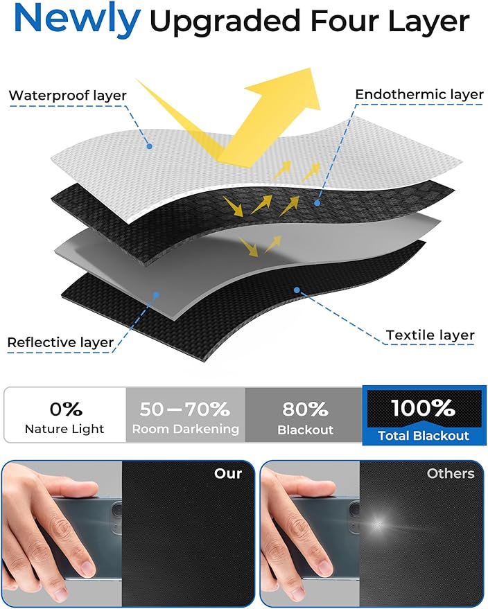 - đă100% BlackoutăSumobaby blackout curtains adopts upgraded reflective silver coating and high-density black polyester, the blackout effect can easily reach 100%. Blocks sunlight and harmful UV rays to darken your room, thermal insulated and enhance privacy.