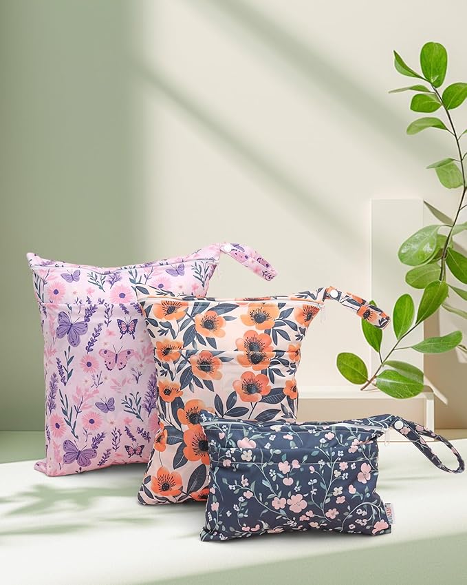 ALVABABY 3 Cloth Diaper Wet Dry Bags Waterproof Reusable with Two Zippered Pockets Travel Beach Pool Daycare Soiled Baby Items Yoga Gym Bag for Swimsuits or Wet Clothes Small medium Large 3L-SML08