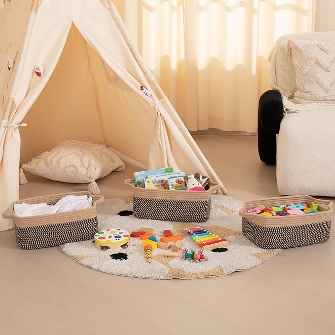 - Multifunctional Storage Basket: With dimensions of 13.78''L×9.84''W×5.5''H, this rectangular basket is designed to accommodate most small household items. Each set of 3 pieces can be sorted to store baby diapers, towels, remote controls, keys, credit cards, wallets, charging cables, toys, snacks, paper towels, cosmetics, jewelry, and more