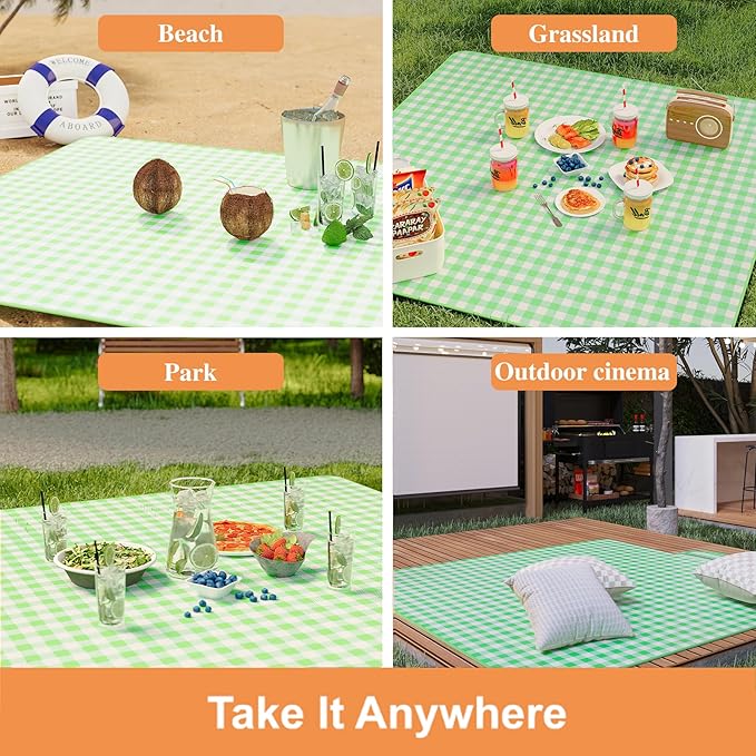 UDEAR Foldable Picnic Blanket,80"x80" Waterproof, Sandproof, Portable with Tote Bag for Beach, Park, Camping, and Travel,Green Plaid