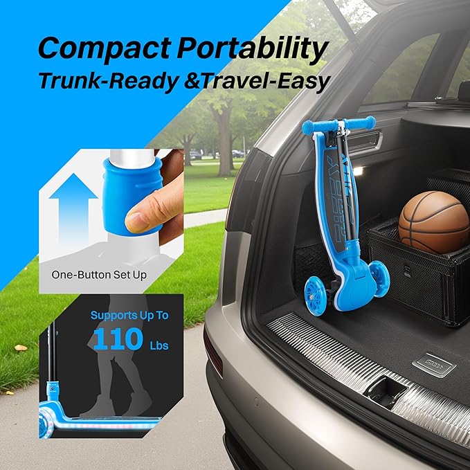 - Compact & Portable – No Assembly Required: Thoughtfully designed to grow with your child, this scooter requires no installation and features a 4-level adjustable handlebar (25.5 / 29.1 / 31.1 / 32.6 inches), ensuring a comfortable fit for years to come. The one-step folding system and lightweight design make it easy to carry and store—perfect for trips to the park, school, or family vacations.