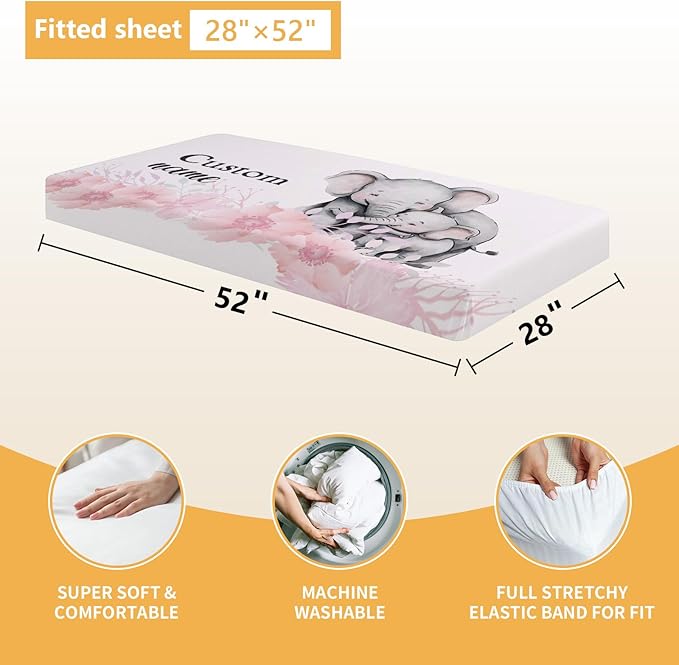 Personalized Baby Bedding Set, 5 Pcs Custom Baby Crib Sets with Name, Toddler Bedding Set for Baby Girls, Pink Elephants Double Layer Nursery Bedding Set, Customized Gifts for Infants Kids