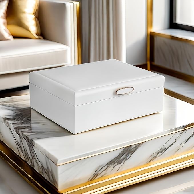 - Luxury Craftsmanship, Timeless Design:Indulge in premium quality that lasts. Encased in high-shine PU leather over a sturdy 9mm density board, this box exudes sophistication from first touch. The magnetic clasp ensures secure closure while the elegant metal handle adds a luxe finishing touch. Inside, a soft beige velvet lining cradles your jewelry, protecting against scratches and tarnish. It’s not just a storage box—it’s a statement piece that complements your style