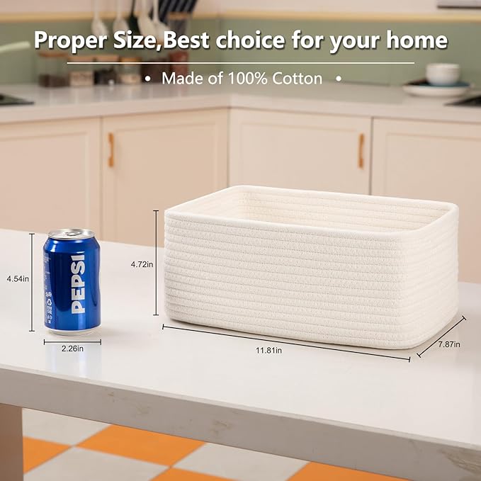 - [Cute & Small Decorative Storage Baskets]: These 4 Pack woven baskets measuring 11.81” x 7.87” x 4.72”, the fantastic woven rope baskets with mini size, which can work as shelf baskets for organizing, cute and practical for home decor, making your home more cozy and attractive